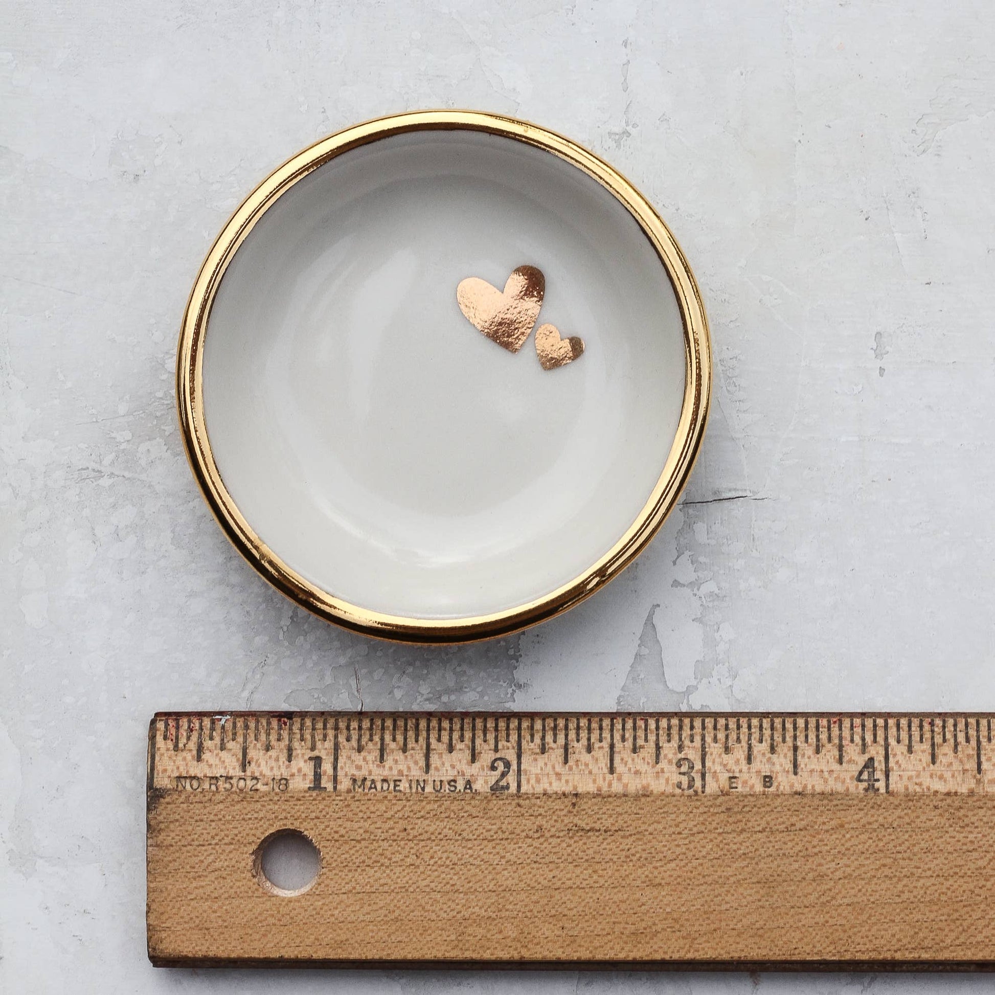 Each trinket dish is unique and feature a clear porcelain white glaze, highlighting two gold hearts.